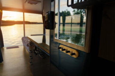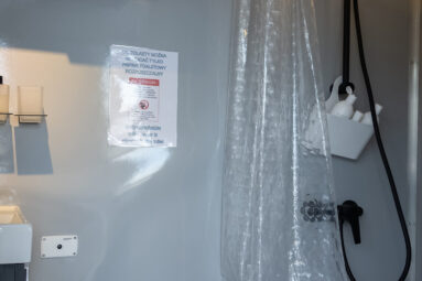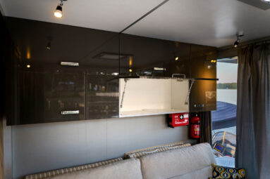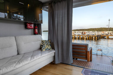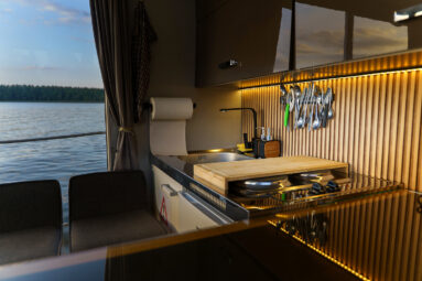 Domek o powierzchni 20 m² pomieści komfortowo 2 osoby, ale dzięki sprytnemu układowi i rozkładanym łóżkom spokojnie przyjmie także 4 Gości. Do dyspozycji masz elegancki salon z panoramicznymi oknami, aneks kuchenny, małą sypialnię, łazienkę z prysznicem, a na rufowym tarasie – wygodne meble wypoczynkowe. Jednostka jest stabilna, odporna na warunki pogodowe i gotowa na każdą przygodę.