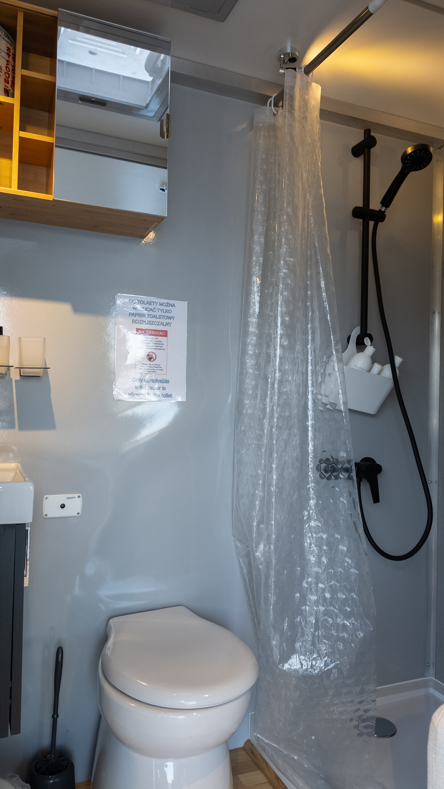 Domek o powierzchni 20 m² pomieści komfortowo 2 osoby, ale dzięki sprytnemu układowi i rozkładanym łóżkom spokojnie przyjmie także 4 Gości. Do dyspozycji masz elegancki salon z panoramicznymi oknami, aneks kuchenny, małą sypialnię, łazienkę z prysznicem, a na rufowym tarasie – wygodne meble wypoczynkowe. Jednostka jest stabilna, odporna na warunki pogodowe i gotowa na każdą przygodę.